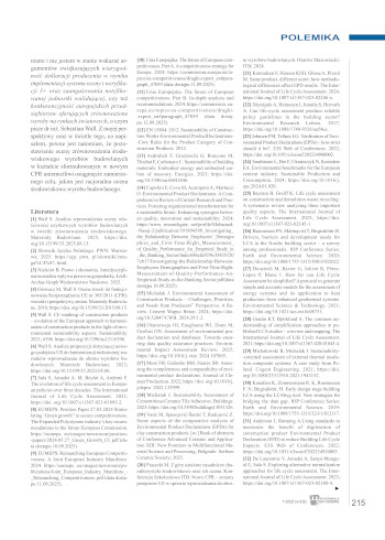 [1] Wall S. Analiza wprowadzenia oceny właściwości użytkowych wyrobów budowlanych w świetle zrównoważenia środowiskowego. Materiały Budowlane. 2025; https://doi. org/10.15199/33.2025.08.13.