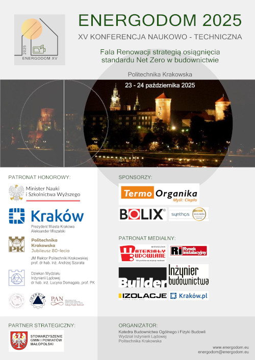 Już wkrótce XV-ta Konferencja Naukowo-Techniczna ENERGODOM, której myślą przewodnią jest „Fala Renowacji strategią osiągnięcia standardu Net Zero w budownictwie”. Wzorem lat ubiegłych obrady odbędą się na terenie kampusu Politechniki Krakowskiej w Krakowie od 23 do 24 października 2025 r.