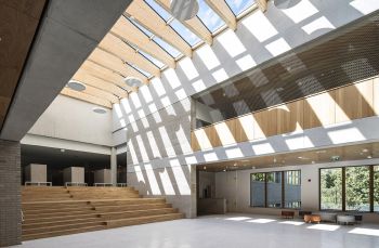 Uzasadnienie: Zastosowanie cegły betonowej na elewacjach nawiązuje do tradycji warszawskich budynków publicznych. Materiał, zwykle kojarzony z ciężarem i trwałością, tutaj staje się pomostem między historią a teraźniejszością, wpisując nową szkołę w ciągłość miejskiej tkanki. Monolityczna konstrukcja żelbetowa, spajająca różne funkcje i przestrzenie, symbolizuje jedność i siłę wspólnoty uczniów, nauczycieli i mieszkańców. Tak jak beton łączy kruszywo w jedną całość, tak szkoła scala różne pokolenia i doświadczenia w przestrzeni edukacji. Barwione w masie elementy, prefabrykaty z indywidualnym oznaczeniem szkoły czy amfiteatr wejściowy pokazują, że materiał może być jednocześnie funkcjonalny i symboliczny. Beton staje się tu językiem codzienności, w którym zapisano rytuały nauki, spotkania i zabawy. Jego surowość i prostota są świadomym wyborem, podkreślającym trwałość wartości edukacji i wspólnoty.