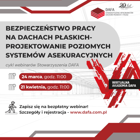 Stowarzyszenie DAFA zaprasza do udziału w eksperckich szkoleniach: „Bezpieczeństwo pracy na dachach płaskich- projektowanie poziomych systemów asekuracyjnych”, realizowanych przy współpracy Okręgowego Inspektoratu Pracy w Opolu.