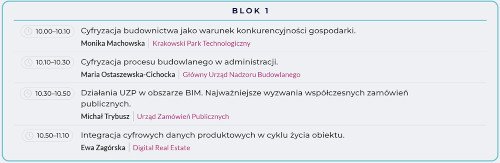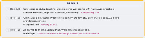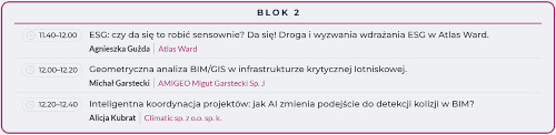 Program konferencji obejmował trzy bloki tematyczne oraz dziesięć wystąpień koncentrujących się na praktycznych aspektach stosowania BIM – od cyfryzacji administracji publicznej, przez zarządzanie danymi i ESG, aż po wykorzystanie sztucznej inteligencji oraz pracę w środowisku CDE.
