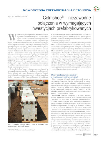Współczesne prefabrykowane budownictwo przemysłowe stawia na rozwiązania umożliwiające szybki montaż elementów żelbetowych z zachowaniem maksymalnej nośności i sztywności połączeń. W obserwowanym od wielu lat trendzie dotyczącym stosowanych schematów statycznych konstrukcji obiektów przemysłowych, najczęstszy jest schemat, w którym główny układ nośny stanowią wspornikowe słupy żelbetowe zamocowane w fundamentach. Kluczowe w takich układach są węzły słup – fundament lub słup – słup, odpowiadające za przenoszenie sił osiowych i momentów zginających oraz decydujące o sztywności przechyłowej budynku. W odpowiedzi na coraz większe wymagania projektowe i montażowe firma PFEIFER opracowała nową generację podpór słupowych Colmshoe®, będącą wynikiem wieloletniego doświadczenia w aplikacji tego typu rozwiązań oraz kompleksowej optymalizacji konstrukcyjnej systemu.